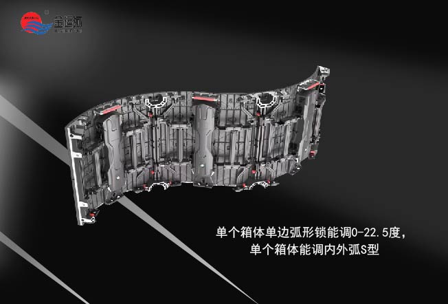 ●单个箱体单边弧形锁能调0-22.5度,单个箱体能调内外弧S型